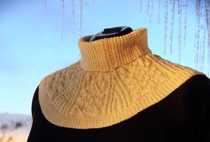 Cowl II is worked in the round bottom up. The first decreases starts after the first ribbed knitting, the chart show the decreases in the cables and the last decrease happens first round off ribbed knitting for the neck. The ribbed knitting for the neck is knitted 15 cm(6") long, but you can knit it shorter or longer if you wish.