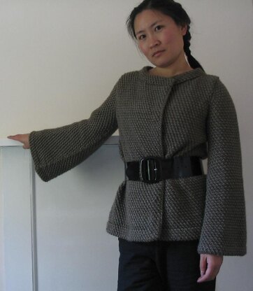 This jacket is all about texture and shape, both kept simple and wearable. The nubbly, woven-like fabric is made with the easy-to-work rosette stitch. The swingy shape can be worn open, or closed with a belt knitted in the same yarn, or with a store-bought belt.