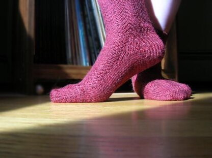 A top down sock in a herringbone twisted stitch pattern, with a ribbed slip stitch heel flap and a patterned gusset and toe. Six page PDF pattern, including both charted and written instructions.