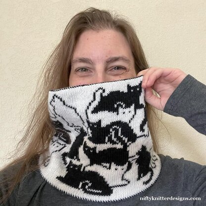 Any cat owner knows that cats have minds of their own. The Herding Cats Cowl shows what happens if you try to herd cats… they just do their own thing. Cute cats cover both sides of this warm, reversible cowl.