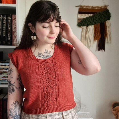 Hermeline is a top worked from the top down. It features a scoop neckline, short sleeve caps shaped with short rows and a fine lace panel down the center front, with both charted and written instructions. The adjustable length and simple construction make it an easy to customize project, that can be worn as a summer top or a vest.