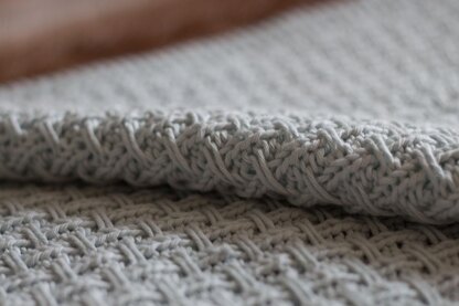 This textured Hessian Baby blanket is so called for the woven quality of the slipped stitch repeating pattern that makes up the body of the blanket. A non-rolling garter stitch border gives a neat yet rustic finish.