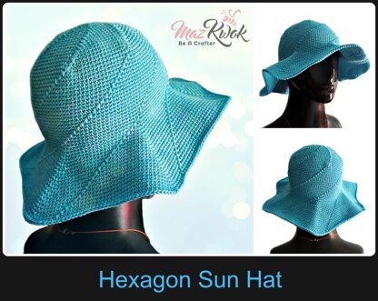 Crochet sun hat designed with hexagon shaped brim and drop stitches.