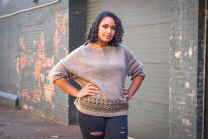 This colorwork pullover is knit from the top down. The front and back collars are knit flat and joined. Short rows are used to shape the neckline. The yoke is worked in the round with raglan shaping, then the sleeve stitches are placed on hold while the lower body is worked, with a band of colorwork just above the ribbed hem. The sleeves are worked in the round down to the ribbed cuffs.