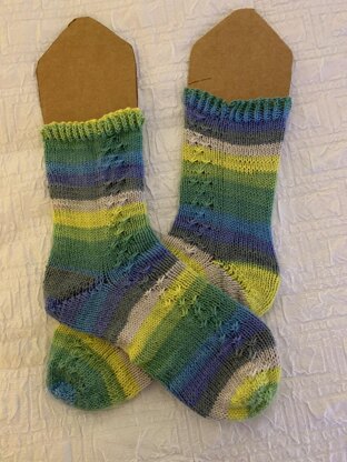 These socks were knit at 2 at a time, toe-up but can be done one at a time if preferred. I give instructions for heels and toes, but you can do a different kind if you like a different style better. I would consider this a moderate-level sock because the one stitch could be a little fiddly for the beginner knitter. Other than that stitch, the overall pattern would be fine for the beginner knitter. The pattern is a texture strip up the side of each sock and the stitch count can be adapted for any size foot.