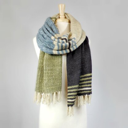 Higgins is a wide and cozy scarf combining narrow stripes and blocks of solid colors. It is knit from end to end, and alternates two simple stitch patterns with an I-cord edging throughout.