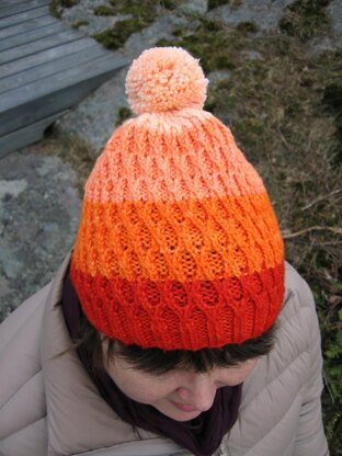 It features a twisted rib brim, and a cable pattern made by crossing two stitches without a cable needle where one stitch is crossing over its neighbor (left over right or right over left). A pompom is an optional finish to the hat.