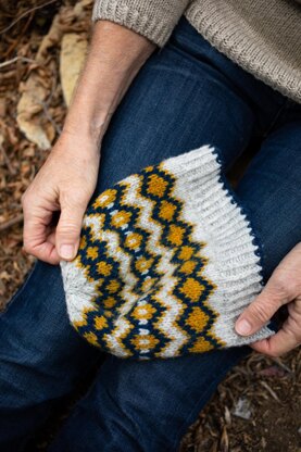 20 sts x 28 rounds = 10 x 10 cm (worked in the round in stranded colourwork, on larger needle, after blocking)