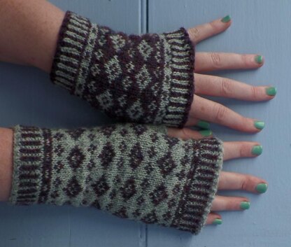 Simple mittens, knitted in two shades of Shetland yarn. The pattern is knitted from the cuff and is available in two lengths with optional thumbs.