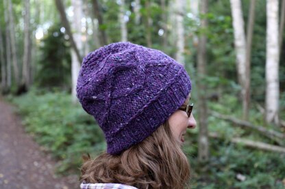The Hilltop hat begins with a familiar rib in the round, but takes a road less travelled to get to the top, by having a cable panel knit sideways as the body of the hat. The crown decreases are worked in garter stitch in the round.