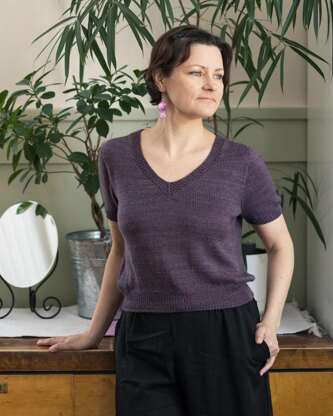 This is a light summer tee with decorative lace panels on the shoulders and short sleeves. The tee is worked from top down with contiguous (developed by SusieM on Ravelry) sleeve shaping. Everything is worked seamlessly; you only have to pick a few stitches from the underarm. There is no shaping on the body, however shaping can be easily modified if preferred.