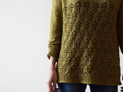 “Himiko” is a boxy pullover with Acorn pattern on the lower body. The pullover is worked from the top down. After casting on, the shoulders are shaped using German short rows. The front and back are worked back and forth separately to the underarm, then joined to be worked in the round to the hem, with Acorn stitch pattern. Sleeves stitches are picked up and worked from the top down in the round and tucks are added before the cuff. The hem and cuffs are worked in 1x1 twisted rib, and all edgings are finished with I-cord bind off.