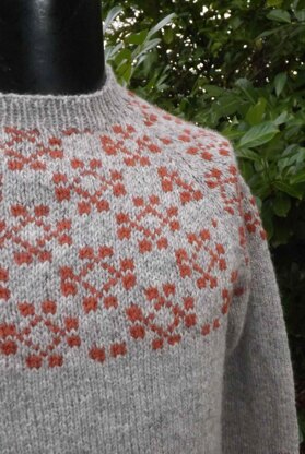 Hinge is a sweater/pullover knitted from the bottom edge and up with a 2-color yoke. The sweater has a raglan sleeve and yoke construction with traditional rib edges. The pattern is made for at yarn with a gauge of 18 stitches per 10 centimeters (stockinette stitch and 2-color stranded knitting) i.e. a yardage of approximately 90 meters per 50 grams.