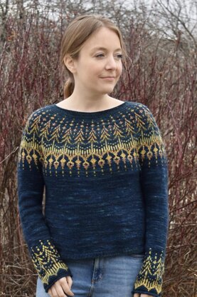 Hinterland is inspired by the northern lights in Norway. This sweater features easy top down and seamless construction, is knit entirely in the round, and options for a rolled or ribbed neckline are included. The cuffs are my favorite part about this design! We knitters often joke about being stuck on sleeve island, but with fun colorwork at the end, it might just motivate you to bang these sleeves out. Fingering or sport weight yarn. Designed to be worn with 3-6” / 7.5-15 cm positive ease. Shown with 4” / 10 cm of positive ease.