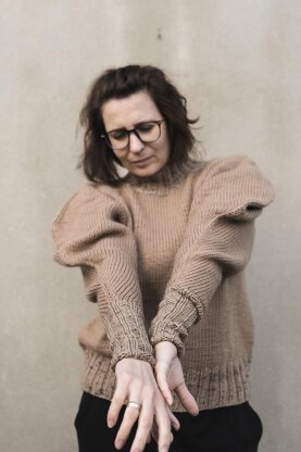 The Hip sweater is a hip-length style knit with a mock neck and long narrowing sleeves. This sweater has a neckline and is worked top-down in Stockinette stitch pattern. The sweater is worked in raglan using increases M1L and M1R. Neck, cuffs and hem are worked in Rib stitch pattern in different colour yarn. The sweater body is worked straight, therefore it can be easily made longer and of course, more yarns should be estimated. The hip sweater is an 80’s fashion style knit with wide sleeves at the shoulders and with very narrow cuffs.