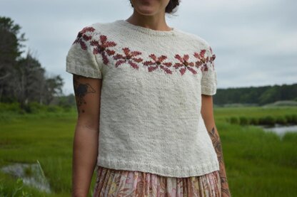 Hippie Wreath is a short sleeve sweater inspired by vintage photographs of flower crowns worn by hippies in the 60’s and 70’s. The design is a minimalist top down sweater knit up with hand spun yarn and features a cute wreath, or ring, of flowers worked in stranded knitting that circle around the yoke. The flowers have a happy little bobble that pops out of the center. The wreath is shown in Spincycle Yarns Dream State yarn but feel free to substitute your own multicolored hand spun yarn! This happy, cute little sweater is quick to knit and an instant mood boost to wear, so go ahead and spread a little joy and flower power and knit up the Hippie Wreath sweater today!