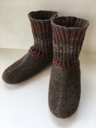 Men's Size 8 - 14! These slippers are knit in one piece - No Sewing Required to create felted slipper. (Sewing required for attaching crew sock and sole) They are designed for moderate coverage with an easy access faux crew sock. Also includes instructions for knitted rim instead of a sock, wide width and how to attach a sole.
