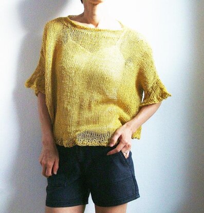 It is worked from the bottom up in the round up to the arm opening, then front and back pieces are separated to work flat. Short rows are added to the shoulder and both pieces are joined at the shoulder. The stitches for the sleeve are picked up at the arm opening, and worked in the round with eyelets to give a nice flare and breezy feel to it.