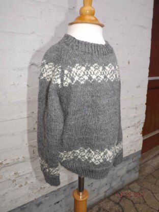 This is a sweater/pullover worked from the bottom edge and up with 2-colored pattern stripes. The sweater has a raglan yoke and sleeve construction. The Sweater has traditional rib edges. The pattern is made for at yarn with a gauge of 28 stitches per 10 centimeters (stockinette stitch) i.e. a yardage of approximate 200 meters per 50 grams.