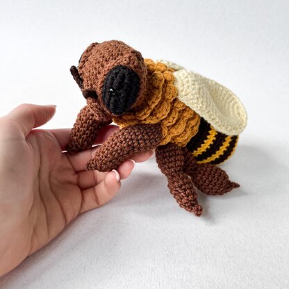 You can sell the toys made by this pattern with the reference to Tumannart. Do not copy, share the pattern or resell it. Materials: *Yarn - I used Alize Cotton Gold (sport weight yarn) - lighter brown for the head, dark brown for legs, antennas and stripes on the body, mustard colour for the first part of the body and stripes on the second, beige for wings, black for eyes *Hook 1.75 mm *Pins *Hollowfibre stuffing *Stitch marker *Safety eyes (6 mm diameter)
