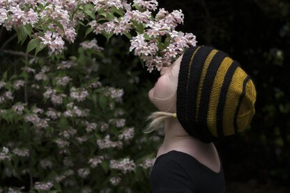 This cute bee-inspired hat is knit bottom up and includes sizing for the whole family.