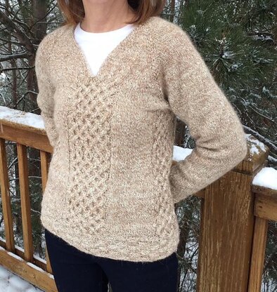 This pullover is knit from the top down and in the round. It features center and side panels of a "honeycomb"pattern. It also features a "wicker" pattern at hem and cuffs.