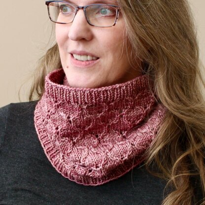 This cowl consists of a pretty honeycomb pattern punctuated with eyelets. It is worked in the round and requires only one skein of worsted weight yarn. Simple left and right cross cable stitches are used to create the honeycomb shapes. The result is a lovely cowl with lots of visual interest. Pattern includes stitch guide, list of abbreviations, and the pattern stitch is both charted and written. Skills required: knitting in the round, cabling with a cable needle. Stitches used: k, p, k2tog, SKP, yo, 1/2 LC, 1/2 RC. Pattern updated February 2022.