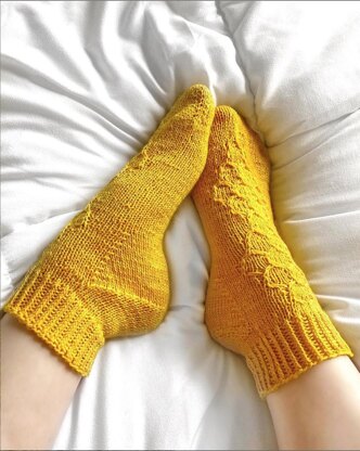 I have always dreamed of being a beekeeper someday when I’m settled down and have laid my roots somewhere. Bees are one of the most vital parts of our ecosystem; without them we would be without food. In honor of the hard work bees do for us, I created this pattern featuring a delicate honeycomb design and a bright pop of yellow — dyed naturally using just turmeric! I hope these socks bring you as much happiness as they have brought me.