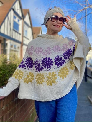 The Hoody Poncho Sweater is a flared shape, which is worked seamlessly top down from the start of the Balaclava style hood. The Poncho is knitted in Soft Tweed to create a wonderfully soft, slightly textured garment and a centre section features a 3-colour Flowery jacquard design.