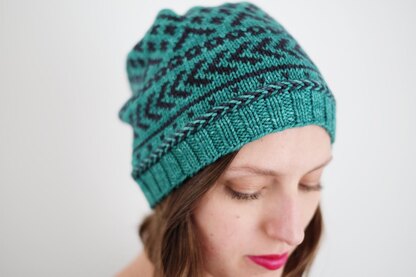 Multiple colorwork motifs dancing across the body of the hat are complemented by a Latvian braid (with linked tutorial) above the ribbed brim, making for a fun and engaging knit suitable for colorwork knitters of all levels.