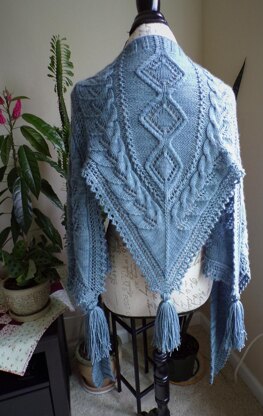 Hope is knit in a slightly unusual manner. The center lace and cable section are 3 separate panels started individually, then joined and worked together in one piece, bottom to top. Sides are picked up along a slipped st. edge and worked using k2tog to create the lower angled edge. Tassels are optional, but a convenient spot to add them is there. Pattern is in Charts only, experienced knitter should be comfortable working this shawl. Materials needed: 1000 yds. Sport Weight yarn, Miss Babs Yummy 3-ply was my choice, and always a great one. Family is the color used. #5, 4.00mm. Knitting Needles. 4 Markers. Tapestry Needle. Finished size after blocking 21" down the middle back and 85" across the shoulders.