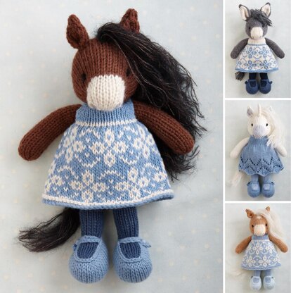 The PDF file contains full instructions for knitting and finishing off a horse, donkey and unicorn with knitted on tights/pantyhose and shoes and a choice of two removable dresses. The file is contains over 70 detailed step-by-step photographs along with full pattern instructions and tips for stuffing, seaming and finishing neatly.