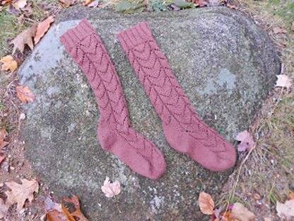 A woman's sock that can be knitted in either fingering wt.(medium) or sport wt. (large). Features a lovely lace pattern, short-row heels, and a new method of knitting with 3 needles instead of 4.