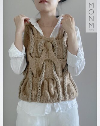 Horseshoe vest is inspired by the U-shaped metal plate that protects a horse's hoof from wear. Garment features large horseshoe cables, bulky statement braids, double knitting trims and ribbing edge. Vest is worked from top down in horseshoe cable stitch in one piece.