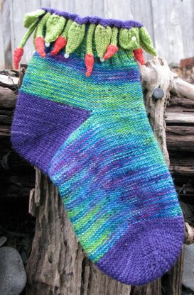 Description These socks are knit from the top down in reverse stockinette with a garter-stitch short-row heel. The cuff is trimmed with exotic foliage and hot peppers.