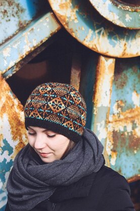 A couple of years ago I bought a childs beret from the saleroom which had a similar motif to this and since then I have always wanted to design a hat which uses the pleasing repetitiveness of an all-over pattern that simply grows into the crown decreases. The colours subtly shade with a bright middle row and the two colourways show how different a pattern appears on a light or dark background.