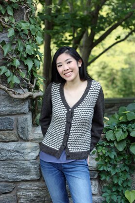 A mock houndstooth fabric is created with a simple slip-stitch pattern. The menswear styling is tweaked with gentle waist shaping.