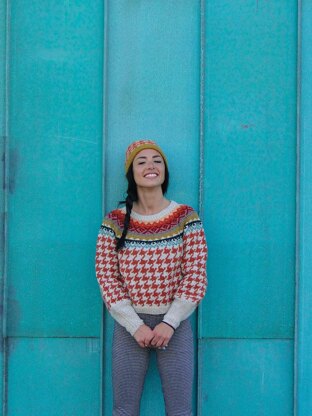 This sweater features an open rib at the back, helping to give a fitted but relaxed fit. It also has visible increases on the cuffs, which give a modern and structured look to the wide sleeves. Occasional rounds of purl stitch on the yoke, as well as Twisted Rib ribbing give textural interest. The neck ribbing is doubled over, using a contrast colour on the underside. A fun sweater to experiment with pattern and colour; the houndstooth motif is a rhythmic and easy one to knit, with dramatic results! Knit in the round from the bottom up.