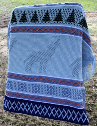 HOWLING WOLF AFGHAN, #618: Capture these dramatic baying wolves as you crochet this one-of-a-kind afghan featuring Native American themes. All color changes are made at the beginning of rows, so you are only working with one color at a time. Cleverly placed dropped dc stitches worked in front loop of stitch 2 rows below form the design. Made using worsted weight yarn in 3 shades of blue with a pop of orange and forest green.