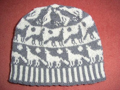 This beanie is striped with howling wolves in white and grey. At the top is a sitting howling wolf and the moon is right at the top of the beanie.