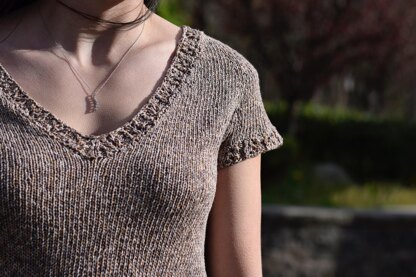 Hoyt is a quick tee with a hint of lace, making it the perfect warm-weather knit. The tee is worked in one piece from the top down with raglan increases. Once the neck is complete, sleeve stitches are put on hold and work is joined in the round to complete the body and lace hem. Stitches are picked up around the sleeves and v-neck for lace edgings which are completed in the round.