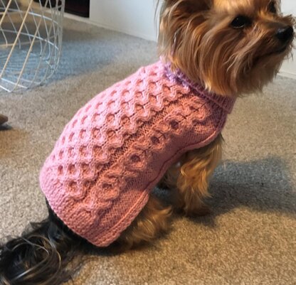 This sweater is worked bottom-up in two pieces that are stitched together. First, the Back is worked in a cable pattern with 8-stitch Honeycomb and Hugs and Kisses cable, stocking stitch and rib. Then the Underbelly is worked back and forth separately in 8-stitch Hugs and Kisses cable, stocking stitch and rib. After completing the Back and Underbelly, stitches from both are worked together to form the Collar. Lastly, the Back and Underbelly sides are seamed together, leaving a gap for the dog’s legs, and the Collar is seamed closed.