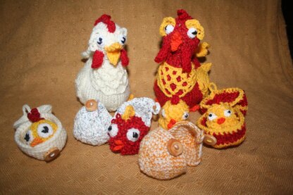 Körper, Kopf, Füße, Flügel und die Kehllappen werden gestrickt, Kamm, Schwanz, Brustfedern, Schnabel, Augenbrauen und die Augen gehäkelt. Das Küken und das Ei werden auch gehäkelt.