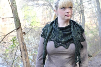Hunter’s Moon is constructed from tip to tip with a stockinette stitch body and a lace edge that is knit as you go. The lace edge features a row of leaves among a gently curving trellis lace pattern.