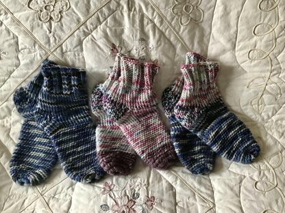 The socks are made using a combo of simple knit and crochet stitches for a unique design. Warm and comfortable. Knit in the round with no seams. Instructions are for foot sizes 6-8. A simple adjustment can be made in the number of chain stitches done in the beginning of the sock for different sizes.