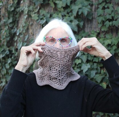 Hynt Cowl has a lovely lace pattern. This is knit in the round, and knits up super-fast. The pattern is written out and charted. Cowl size shown.