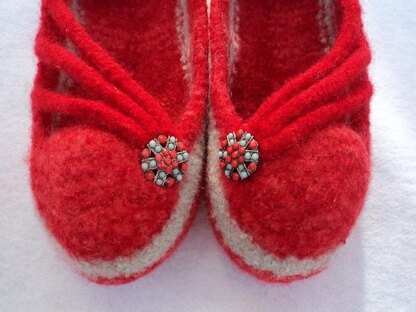 The slippers are knitted in the round as well as straight knitting and uses 100% wool worsted weight yarn, basic knit stitches, 24" or 29" circular needles. Skill level, moderate, short row knitting involved as well as i-cord knitting. Machine washing for felting technique.