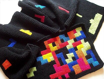 This is an homage to old-school video games, which I designed for my friend Rowan. It shows a Space Invaders cannon playing Tetris by firing the blocks down the length of the scarf.