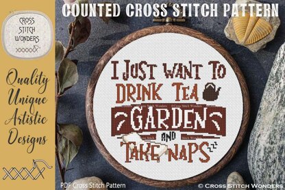 A wonderful saying for any GARDENING enthusiast!\n\nI Just Want To Drink Cocktails / Coffee / Beer / Wine / Tea ....GARDEN and Take Naps!\n\nIncluded in chart are five beverages and also five color combinations for you to choose from.\n\nOriginal and licensed artwork by Funky Frog Creative Designs.\n\nCross Stitch Pattern designed by Marcia Manning.\n\nDesign is 100 stitches wide by 90 stitches high.\n\nPDF is a Black and White counted cross stitch chart which lists suggested DMC floss colors, and includes color pictures.\n\nStitched design size is as follows:\nSize 11 count: 9.09 x 8.18 inches or 23.09 x 20.78 cm\nSize 14 count: 7.14 x 6.43 inches or 18.14 x 16.33 cm\nSize 16 count: 6.25 x 5.63 inches or 15.88 x 14.29 cm\nSize 18 count: 5.56 x 5.00 inches or 14.11 x 12.70 cm\nSize 22 count: 4.55 x 4.09 inches or 11.55 x 10.39 cm