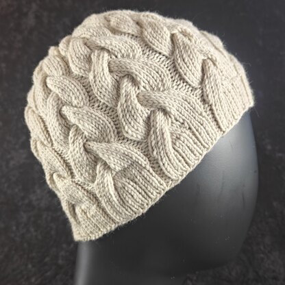 Knitting in the round allows the use of 10 stitch, every 5 row cables without the confusion of working wrong side rows. The large, cabled braids create a delicious texture and a warm, cozy feel. The ribbing transitions smoothly to the braiding, which continues throughout the crown, giving a tapering effect.